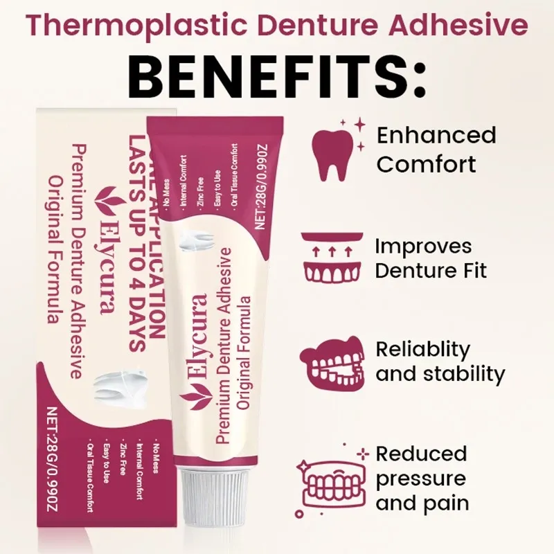 The thermoplastic adhesive category has been rigorously studied in dental prosthetic literature. Research published in the Journal of Prosthodontics documents that silicone-based soft liners (the clinical equivalent of thermoplastic adhesives like Elycura™) demonstrate: